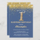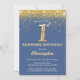 Surpresa primeiro aniversario Azul e Dourada Glitter Confetti Aniversário. Para mais personalização, clique no botão "Personalizar" e use nossa ferramenta de design para modificar este modelo.