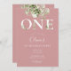Um belo convite para o primeiro primeiro aniversario com um verde floral de cor d'água sobre um fundo cor-de-rosa rosa poeirento. Projetado por Thisnotme©