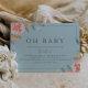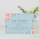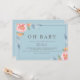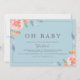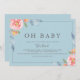 Este primeiro convite para chá de fraldas floral horizontal, oh bebê é perfeito para um chá de fraldas primavera. O design moderno apresenta flores cor de água rosa e laranja sobre um fundo azul claro.