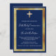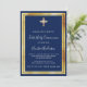 Um moderno, elegante e convite. Um fundo azul marinho decorado com uma cruz, falso armação de ouro. Personalize e adicione um nome e detalhes. Texto branco.