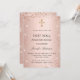 Um fundo de aparência metálica falsa rosa dourado. Decorado com rosa dourado, poeira cintilante rosa e uma cruz. Personalize e adicione um nome e detalhes. O nome é escrito com um script de estilo manuscrito