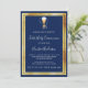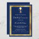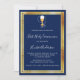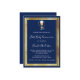 Um moderno, elegante e convite. Um fundo azul marinho decorado com chalice e um hospedeiro, quadros de ouro falsos. Personalize e adicione um nome e detalhes. Texto branco.