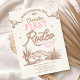 Primeiro convite para o primeiro aniversario de Rodeio, Pink Vintage Desert First Rodeo Convite para o primeiro aniversário de moças cor-de-rosa e castanha, com uma paisagem desértica com cacto, vacas longas, sol e uma corda como o texto. O primeiro convite de aniversário de rodeio desta rapariga é ideal para uma primeira festa de aniversário de temas do oeste selvagem.