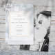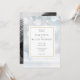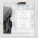 Com delicados flocos de neve caindo sobre um fundo de geada de inverno. Os detalhes do seu casamento estão dentro de uma borda geométrica dourada elegante com sua foto especial no verso. Criado por Thisisnotme©