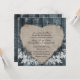 Este convite de casamento em estilo country apresenta uma imagem de fundo de madeira velha, de cor azul-rústica, um pergaminho rasgado e flores brancas. Shabby, mas chic.