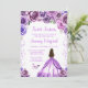 Este convite de aniversário sweet sixteen elegante e glamoroso apresenta uma bela princesa com cabelos castanhos e pele clara em um vestido roxo claro. O texto combina caligrafia manuscrita e fontes modernas sem serifa para um visual sofisticado e elegante. Os arranjos florais, borboleta e confetes criam a combinação perfeita de rústico e chique.
