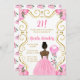 Este convite de aniversário apresenta uma elegante estrutura dourada, uma bela princesa com pele escura e um vestido cor-de-rosa, flores e um balão. Isto é perfeito para uma festa de aniversário.