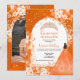 Uma elegante e moderna reviravolta para a Quinceañera tradicional com uma rosa de coroa tiara de ouro reluzente, e um vestido de princesa laranja onde você pode mudar a pele e a cor do cabelo (basta ir à ferramenta design e escolher a pele e a camada de cabelo e escolher sua cor). Apresentando um bonito buquê floral e botânico com rosa dourado confetti e uma forma moderna de arco brilhante, com uma elegante tipografia Quinceañera aniversário com pintura manual de princesa cor laranja com brilho. Adicione a sua foto atrás, perfeita festa de aniversário de Mis Quince com uma rosa-princesa de ouro tiara.