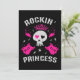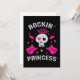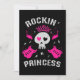 Design fofo apresenta uma caveira com olhos em forma de coração e duas guitarras elétricas cruzadas, e a citação "Princesa do Rock".