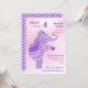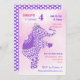 Um elefante roxo e branco, que veste uma coroa princesa; convites de festas roxos e cor-de-rosa divertidos; ideal para raparigas e tão fácil de personalizar com o nome pessoal, a idade e os detalhes da festa do seu filho