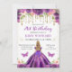 Elegante aquarela Loira Camada princesa em design de roupas roxas profundas com flores roxas e douradas, borboletas e confete dourado.