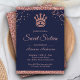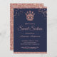 Convide seus convidados com este elegante e doce convite de dezesseis, que apresenta uma bela coroa de ouro rosa e uma tipografia moderna em fundo azul. Basta adicionar os detalhes do seu evento neste modelo fácil de usar para torná-lo um convite de tipo único. Sacudir a placa para revelar uma textura azul de brilho rosa dourado na parte traseira da placa.