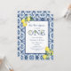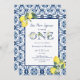 Este primeiro aniversario elegante tem um tema de limão mediterrânico. A borda é um azulejo mediterrânico clássico, azul-aquarela e branco, com limão de aquarela e buquês florais. O texto é caprichoso e clássico ao mesmo tempo.