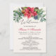 Casamento de Inverno. Programa de casamento - este design apresenta uma Poinsettia aquarela com um arranjo de visco, ramalhete de pinheiro, pinhas, frutos e sinos de trenó. A cor do fundo (frente e verso) pode ser alterada.