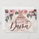 Convite de Proposta de Dama de Quinceañera floral moderno. Design com vestido rosa dourado, elementos florais em um fundo pérola brilhante e brilho de rosa dourado falso no verso. Personalize com um nome.