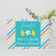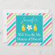Uma maneira adorável de pedir à sua Matron de Honra para fazer parte do seu casamento, este convite apresenta um lindo fundo rosa, verde e azul, distribuído diagonalmente, com uma caixa azul e branca no meio. A caixa tem uma modelo para personalizar o nome dela com "Você será minha mãe de honra?" escrito com uma linda fonte branca. Personalize o seu hoje!
