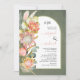 As flores tropicais das proteas pampas, a erva e o eucalichipre, deixam o convite para o casamento em arco verde. Este bonito design de casamento apresenta um quadro de arco sobre fundo manchado verde com seus ínitmos e texto. À esquerda há flores de proteína, gramíneas-pampas e folhas de eucalipto.