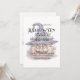 Convite para festas de Halloween com uma abóbora de aquarela bonitinha vestindo um chapéu roxo na frente e jack-o-lanternas assustados e casa assombrada no fundo.