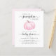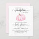 Um convite de chá para bebês virtuais, bonito, alegre e econômico, com "A Sweet Little Pumpkin Is On Her Way" escrito em uma mistura de tipografia moderna de cinza mole e roteiro de na moda, e uma aquarela rosa pastel de uma abóbora. Personalize o nome da mãe e os detalhes do chá em uma simples tipografia de cinza.