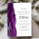 The left-hand edge of this elegant modern wedding anniversary party invitation features a purple watercolor agate border trimmed with silver faux glitter. The customizable text combines charcoal gray handwriting, copperplate and italic fonts on a white background. The reverse side features a matching purple and silver agate design.