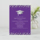This modern design features a graduation hat and confetti in silver on a background of purple with white text.