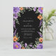 This design features a striking black backdrop that allows the vibrant floral arrangement to pop. Rich purple roses and delicate lavender sprigs are paired with bright orange blossoms and lush green leaves. The mood is dramatic and sophisticated, perfect for an evening event. The watercolor style adds a touch of artistic elegance to the botanical border.