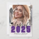 Classic Modern Graduation Announcement & Party Invitation. The front features a full-page photo with a white gradient at the bottom that fades seamlessly into the image. Over the gradient, the year appears in a bold purple classic school-style font. Just above it, "Class of" is written in elegant black script so it would be 'Class Of 2026' or any year. To the left of the year is a small, customizable graduation cap icon, which you can change to match your color scheme. Below the year, the graduate's name and school name are prominently displayed. All colors can be customized to match school colors or personal preferences.