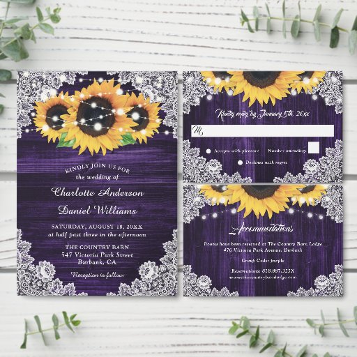 Convite Purple Sunflower Wood Lace String Lights Wedding