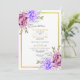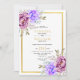 Flores azuis púrpuras e roxas, cor d'água, cor d'água floral convite de casamento. Uma adorável design de casamento que inclui flores aquáticas em tons de azul roxo e púrpura e folhas. Os detalhes estão em um quadro dourado.