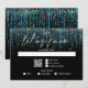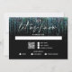 Moderno Abstrato RSVP - Negrito edgy cascata de brilho azul-turquesa desce pela página, em caligrafia manuscrita está "deixe-nos saber" - iniciais do casal no topo - o resto do texto é simples e limpo - tudo em um fundo preto. Papelaria de casamento elegante.