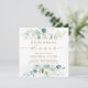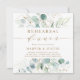 Este convite de jantar de ensaios apresenta eucalipto pintado à aquarela, folhas verdes botânicas e brilho dourado com escrita dourada.