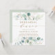 Este convite de jantar de ensaio apresenta eucalipto pintado aquarela, folhas verdes botânicas e brilho dourado com escrita dourada.