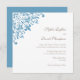 Convite de casamento chic e elegante com design de padrão fleur de lis azul francês regência. Padrão detalhado de canto fleur de lis em azul francês. Personalize com seus nomes e informações do casamento em letras taupe escuro.