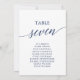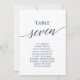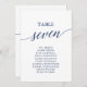 Estes elegantes cartões azuis da mesa número 7 assentos são perfeitos para um casamento simples. A design neutra apresenta uma carta minimalista decorada com tipografia romântica e caprichosa. A placa impressão na frente e atrás (lado duplo).