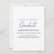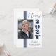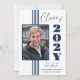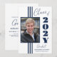 Este convite de festa de formatura da turma de 2025 tem um design elegante com listras azuis, quadro de fotos e texto em um fundo branco.