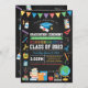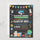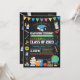Convite de formatura colorida para a classe do jardim de infância, edite para qualquer ano. Este design apresenta um pano de fundo do quadro e material e elementos coloridos para a escola. Personalize este design para a sua classe do jardim de infância! Também disponível para a pré-escola e 5º ano!