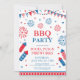 convite de festa de churrasco festivo de 4 de julho com quadro de moldura, bandeiras e fogos de artifício