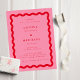 Um convite de casamento moderno e na moda com uma vibração retrorreflectora com um quadro de couro cabeludo em vermelho com fundo rosa, com texto vermelho.