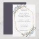 Convites de casamento com moldura geométrica dourada e florais e folhas em azul poeirento em aquarela romântica. Adicione os detalhes do seu casamento, altere as cores, tamanhos ou estilos de letra deste convite de coroa botânica moderna. Este design elegante é ideal para casamentos de primavera e verão.