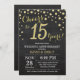 15 de Aniversário de Chalkboard Black e Dourado Convite. 15º Aniversário de Casamento. Quadro negro e fundo de diamante brilhante Dourado. Dourada Confetti. Aniversário Adulto. Mulher ou Festa de aniversário masculina. Para mais personalização, clique no botão "Personalizar" e use nossa ferramenta de design para modificar este modelo.
