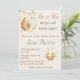 Convite de Revelação do Sexo do Bebê Abelha Mel com um lindo desenho de abelha em aquarela e colmeia dourada. Perfeito para uma doce festa de revelação do sexo, este convite é uma escolha encantadora para um tema de abelha mel com um estilo suave e neutro em relação ao gênero.