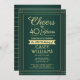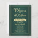 Convide familiares e amigos para uma elegante celebração de aniversário com convites de festas verdes e dourados personalizados. Toda a redação desta modelo (incluindo "Saúde a 40 Anos") é criada para um aniversário de 40 anos, mas é simples de personalizar para qualquer ano ou tipo de evento. A design apresenta uma fronteira moderna distribuída sobre um fundo verde ombre, caligrafia com script na moda, e tipografia clássica com arte de vintage. Observe que o ouro é impresso a cor, não a folha metálica. A design neutra do ponto de vista do gênero também é adequada para um homem ou para uma mulher. Feliz Aniversário!