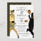Este convite de aniversário da década de 20 inclui um design frontal e traseiro que mergulha totalmente os convidados em um tema de 1920 glamouroso. A frente apresenta uma cena festiva com uma flapper e um homem bem vestido dançando contra um pano de fundo de um confete de ouro, enquanto a tipografia vintage ousada destaca os detalhes do evento. A design de coordenação traseira apresenta um padrão contínuo de escalpo preto e dourado, melhorando a vibração opulenta da fala. Perfeito para um aniversário de um marco ou celebração temática, este design exumenta sofisticação, diversão e talento de Gatsby-era que estabelece o palco para uma festa inesquecível.