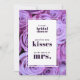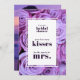 Rosas Mínimos Modernos Roxos Quantos Kisses Chá de panela Game Tabletop Card Torne seus detalhes de evento pop com esta elegante tabletop card! Esta placa personalizável 5x7 apresenta um belo pano de fundo de aquarela de rosas roxas românticas, perfeitamente enquadrado por um layout branco limpo. A frente é projetada com o jogo divertido, "adivinhem quantos 'beijos' para que em breve seja 'sra.'", colocado em um roteiro elegante. É personalizado com o nome da futura noiva e as palavras "Chá de panela". Esta bela carta de mesa é a forma perfeita de fazer com que os convidados se envolvam numa atividade de chá de panela divertida. Mas a melhor parte? As costas! É uma canvas maravilhosa para uma fotografia memorável da futura noiva, completa com uma elegante tipografia do seu nome futuro. Isso garante uma exibição sem falhas de qualquer ângulo quando colocada em suportes de cartão, suportes de madeira ou suportes de clipes (não incluídos). Esta manutenção é uma adição impressionante e funcional ao seu evento. Simplesmente personalize-o com o seu nome e detalhes para criar uma bela placa de jogo moderna.