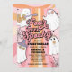 Um convite de festas de 4º aniversário do Quatro Nunca Spooky! Apresentando ilustrações bonitas de fantasmas hippie e tipografia retrô.