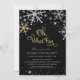 Festa de Natal festiva, mas formal, ou design de convite de festas de Ano Novo apresenta flocos de neve prateados e dourados e "Oh, Que Divertido" na escrita, e textos que podem ser personalizados para o seu evento especial. A borda do floco de neve e o script têm uma aparência brilhante texturizada em um fundo preto.
