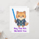 Adorável gato tabby ginger vestido de Jedi segurando um sabre de luz azul com o texto Que o 4º seja com você.