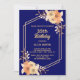 Um convite de aniversário elegante e elegante que inclui um arranjo de flor de laranja e folhas marrons com tipografia de ouro moderna num fundo azul-marinho.