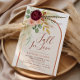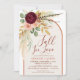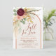 Celebrar a noiva a estar com esse chá de panela de outono apaixonado, com uma elegante queda aquosa buquê floral de flores vermelhas da burgundy, rosas rosa escamosas, verde de eucalipto, penas faisões, folhagem de grama de pampas seca, folhas de outono de ouro e muito mais. A design é colocada sobre um fundo branco e enquadrada por um arco gracioso, mas moderno, no bege de laranja e de farinha de aveia, quente, em terracota, por uma sensação natural e terrestre. Com o seu moderno estilo rústico boho, este convite dá o tom perfeito para uma celebração do outono. Par com placas de coordenação, obrigado cartas, jogos, favores e decoração da suíte de eventos Fall in Love para um chá de panela belamente coeso neste outono.