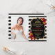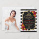 Quinceanera convite de festas com sua foto. Apresenta faixas brancas pretas, fontes de script, rosas vermelhas, girassóis, tiara e confetti. Design vermelho preto clássico com ouro brilhante. Perfeito para uma celebração elegante. Personalize com seus próprios detalhes.
